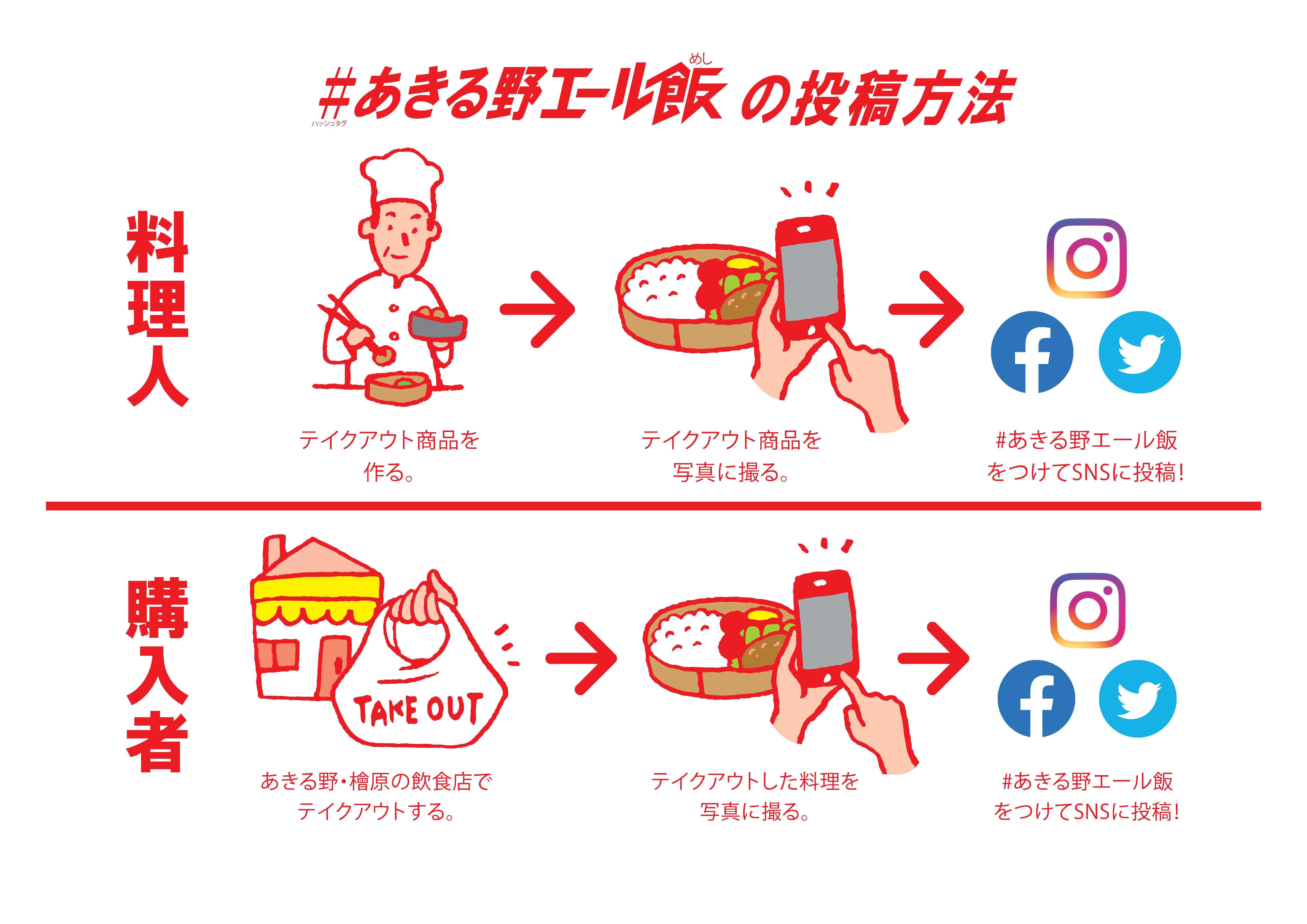 檜原村及びあきる野市内の飲食店のテイクアウト・デリバリー情報をSNSに投稿する場合は、「#(ハッシュタグ)あきる野エール飯」をつけて投稿してください。