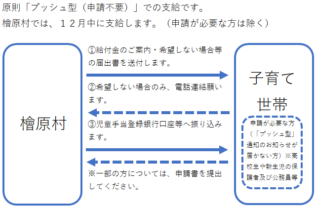今回、支給を受けるにあたって、原則として、「プッシュ型(申請不要)」による支給を行いますので、改めての申請は不要です。(高校生等の方は申請が必要です。)