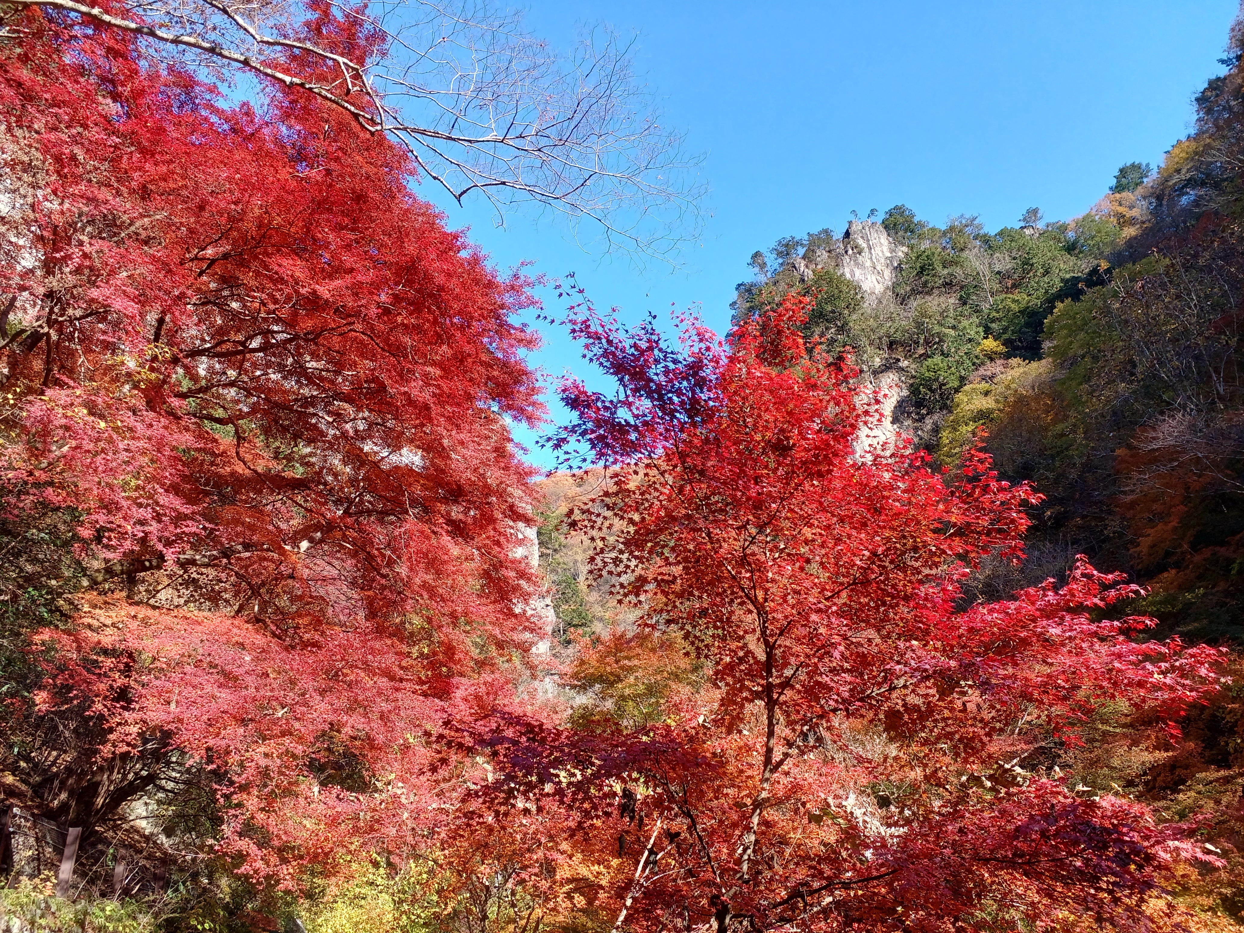 「秋川渓谷」沿いの紅葉は、11月初旬から見頃になりますが、特に北秋川の上流である神戸川に現れる巨大岩石は、東京都指定天然記念物「神戸岩」で、長い年月をかけて浸食された巨岩は左右対となり、今はその間が遊歩道として整備され、素晴らしい紅葉を楽しむことができます。